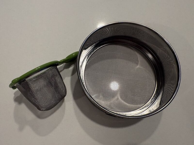 アメリカの粉ふるいは「ハンドルを握ってシャカシャカする巨大なカップ型」が主流で、洗うのが非常に面倒です。日本の持ち手つきのストレーナー型(写真左)は、少量だけ振るいたい時(仕上げの強力粉など)に片手で使えて重宝します。写真右のものは、相当量振るいたい時はもちろん、カスタードなどを濾すときにも使えるので便利です。