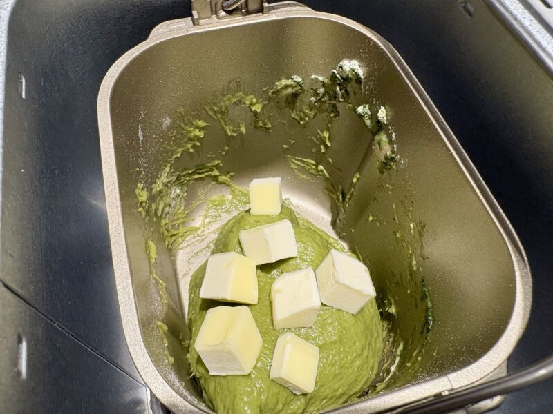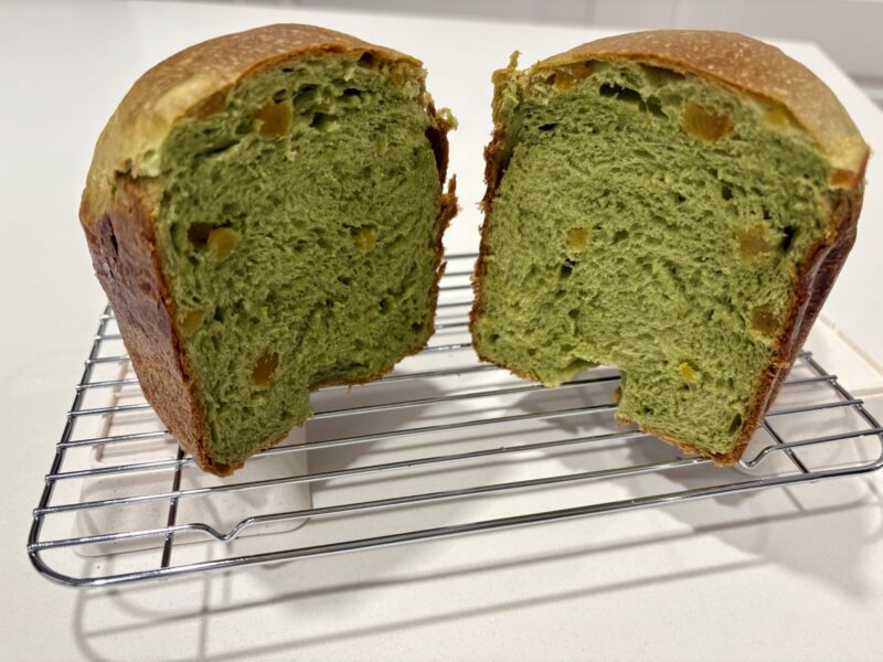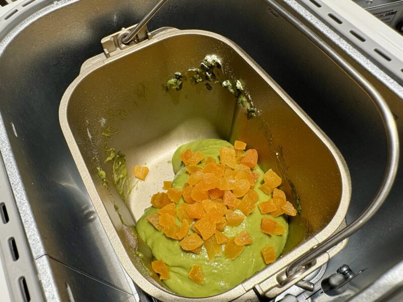 具材入りのブリオッシュ風食パン(メニュー6番)も焼いてみました。こちらは、公式レシピの黒豆&栗入り抹茶ブリオッシュ風食パンをアレンジ、アプリコットを入れたもの。バターと具材は後入れです。