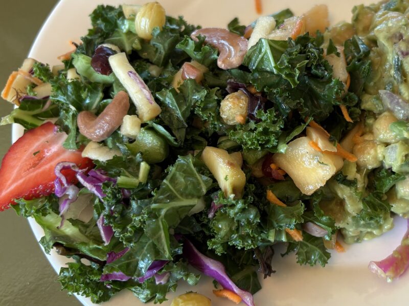 左のサラダは私がケールと出会うきっかけになったレストランのサラダです。家で食べる際はなかなか何種類もの材料を入れる余裕がなく、右の写真の通りとてもシンプルなサラダになっていますが十分おいしいです。