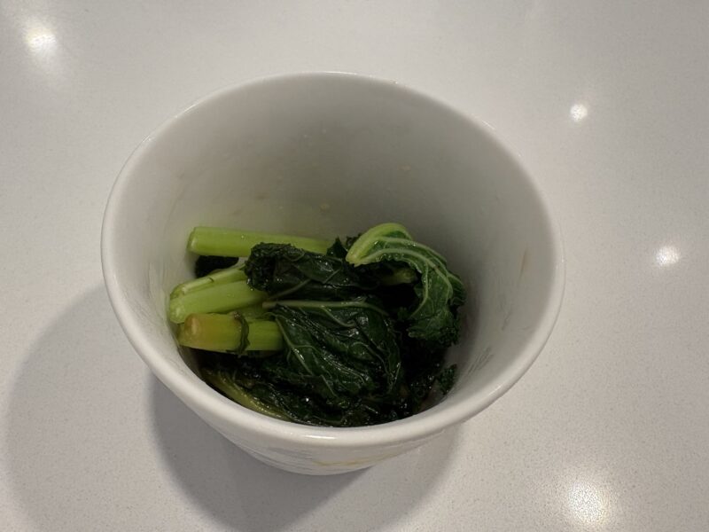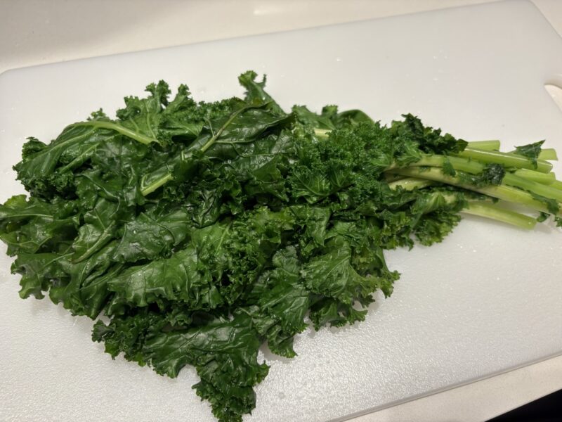 - ケールをさっと下茹でする(根本から先に茹で始め、時間差で葉部分を茹でる)