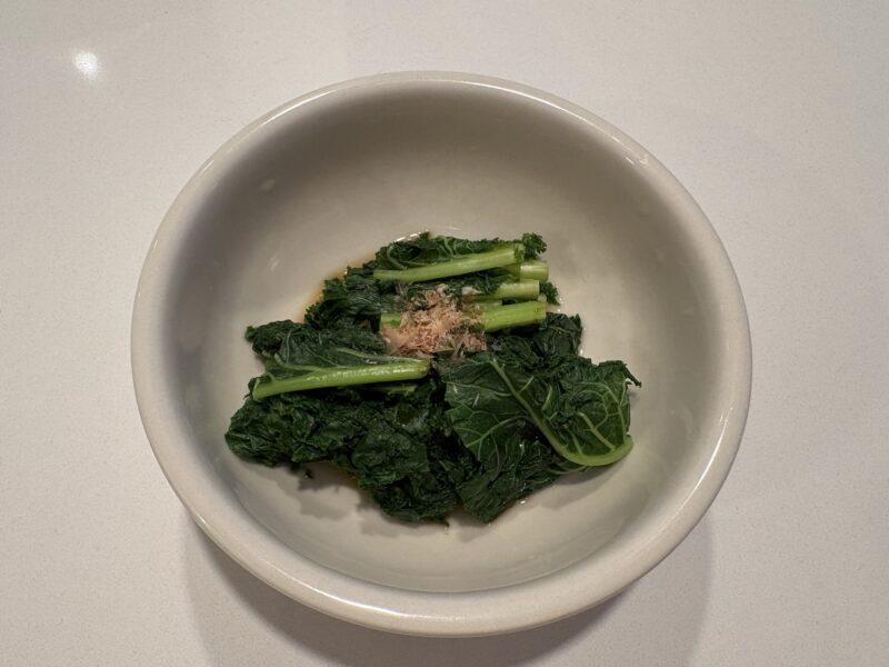 - 薄めた醤油またはめんつゆをかけて完成(鰹節があるとよりほうれん草のお浸しに近づきます)