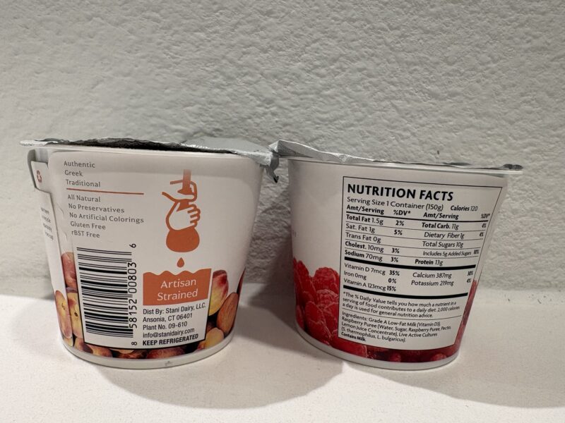 ハニーとココナッツが気になっていましたが、最寄りの店舗にはなく、ピーチとラズベリーを購入しました。カロリーはピーチが130kcal、ラズベリーが120kcalとプレーンタイプより控えめ。2%ミルクを使用している分脂肪分やたんぱく質が少ないですが、糖質はやや多めです。