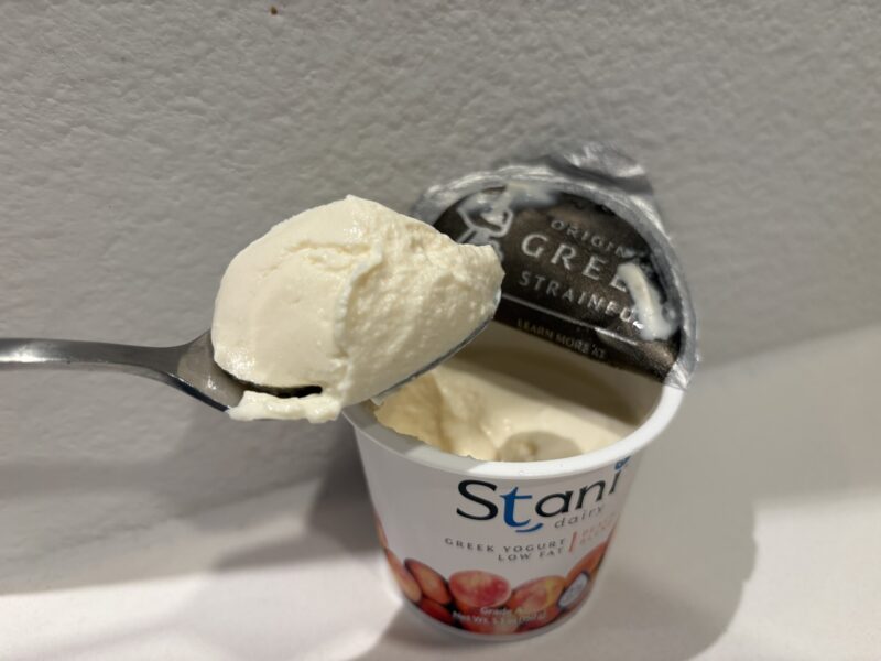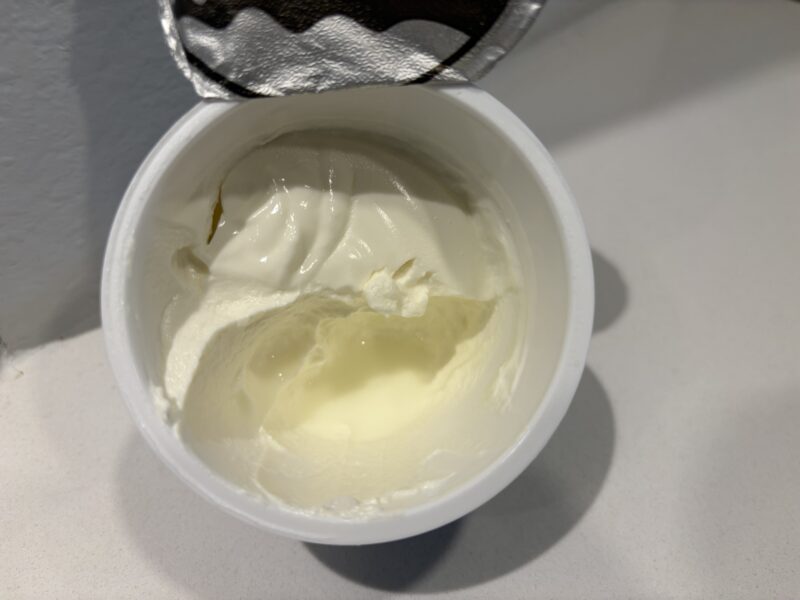 開けてみるとこんな感じ。プレーンタイプ同様濃厚さが一目でわかります。やや黄身がかった色をしており、ヨーグルト全体にフレーバーが混ざっているのが分かります。私はソースが混ざっていないタイプのほうが好みですが、アメリカはこのブレンドタイプのヨーグルトが多いです。