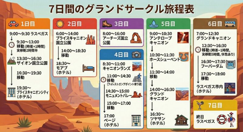 いかがでしたでしょうか。時間が許すようであればザイオン国立公園で丸1日ハイキングを楽しんだり、モニュメントバレーでバレードライブを楽しんだりと、各スポットをさらに深く楽しむのもよいかと思います。