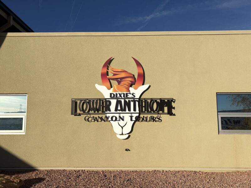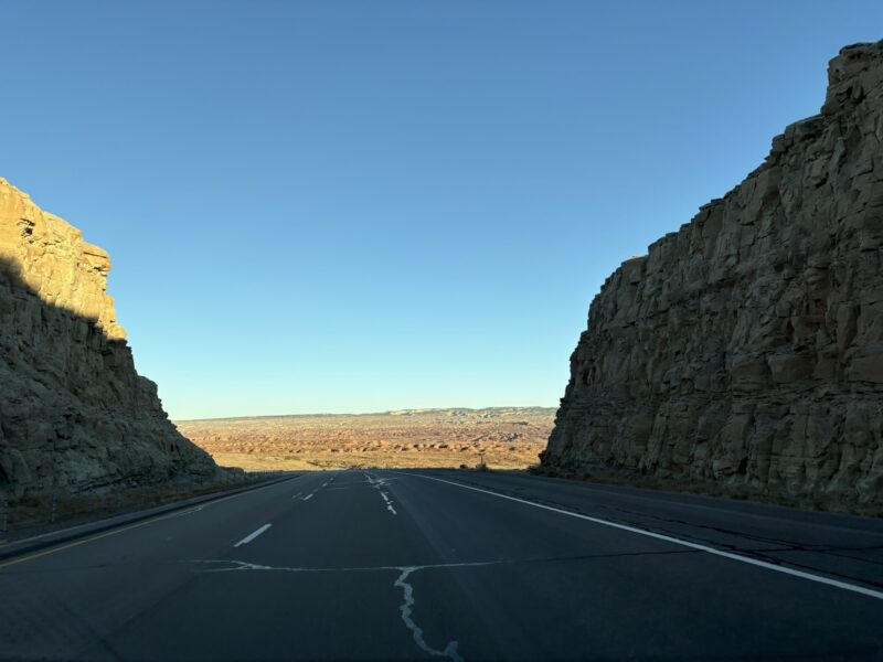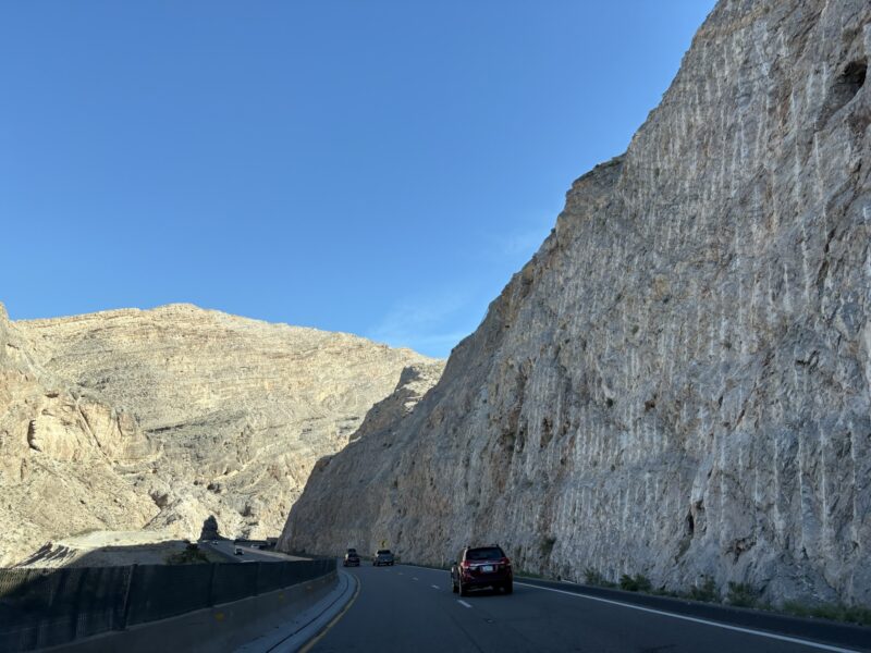途中、ラスベガスサインに立ち寄りました。比較的朝早い時間でしたので、人も少なく、落ち着いて写真を撮ることができました。その後は約2時間強、アメリカらしい広大な道を進みます。途中でネバダ州→ユタ州の州境をまたいだため、時間が1時間進みました。