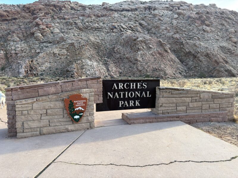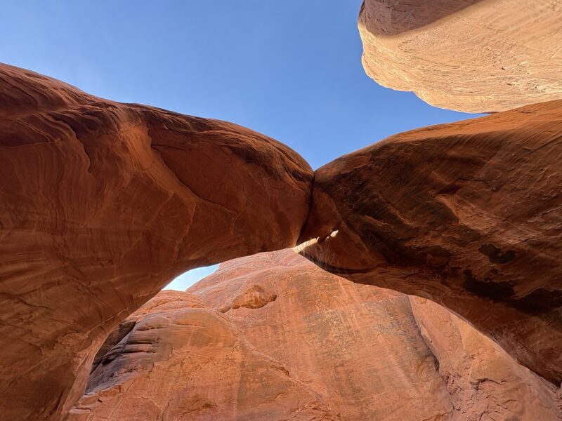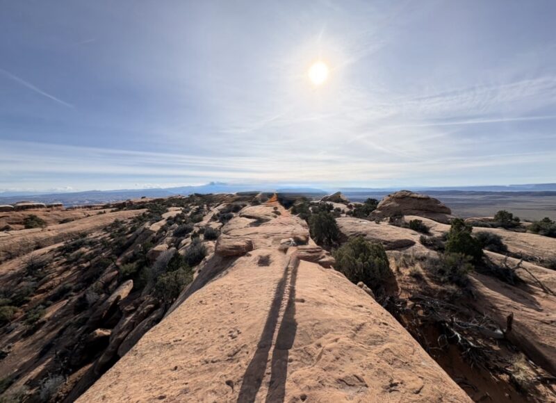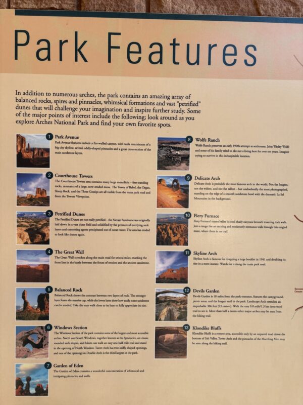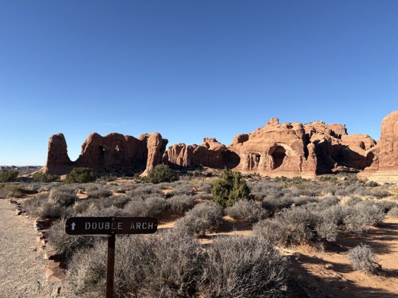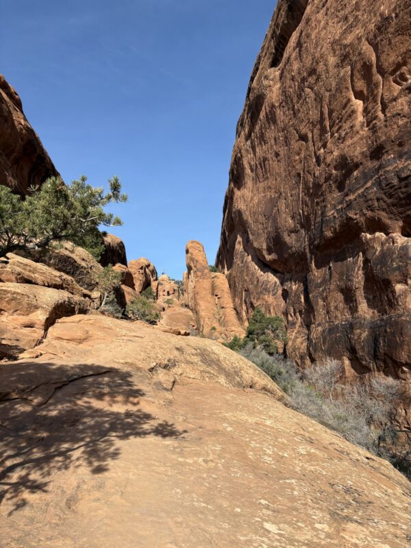 右の画像は、Double Archまでの入り口。行くのは容易ですが、私はすでに体力が枯渇しており向かうことができませんでした。Archesは砂地、段差、高低差の激しい地帯なこともあり結構体力を消耗するので、事前に必ず観たいアーチを決めておき、計画的に回ることをおすすめします。
