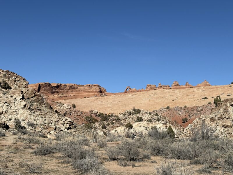 左の画像の遠くに見えるのがDelicate Archです。こちらは、Upper Delicate Arch Viewpointからの眺めで、近くで見る場合は5kmのトレイルを進む必要があります。
