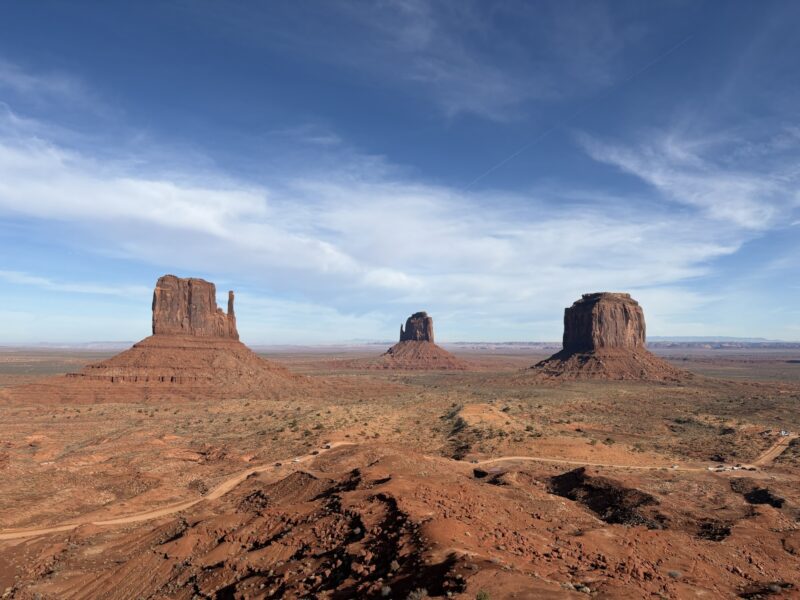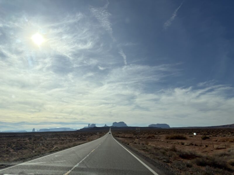 US-163号線沿いにある絶景ビュースポットで、モニュメントバレーの赤いビュート(孤立丘)がまっすぐ伸びる道路の先に完璧に並んで見える場所です。映画『フォレスト・ガンプ/一期一会』で、主人公フォレストが長いアメリカ横断ランニングを“ここで終える”という象徴的なシーンが撮影されたことで有名になりました。