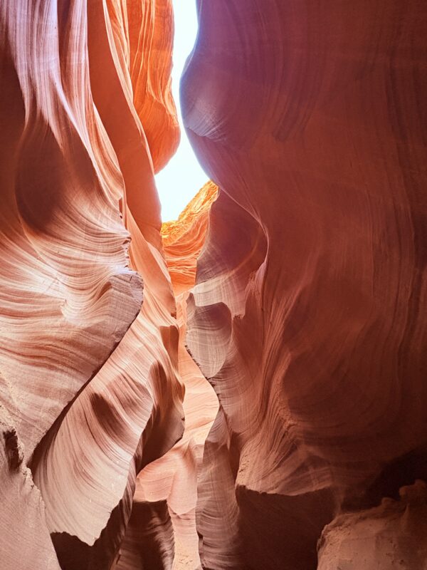 アンテロープキャニオンは、アリゾナ州にある世界的に有名な「スロットキャニオン」で、波のようにうねる岩壁と光のカーテンが美しい場所です。太陽光が差し込むと、岩肌がオレンジ・ピンク・ゴールドに輝き、憧れのスポットとして知られています。自然が作り出した幻想的な空間で、まるで地球の内部を歩いているような体験ができます。