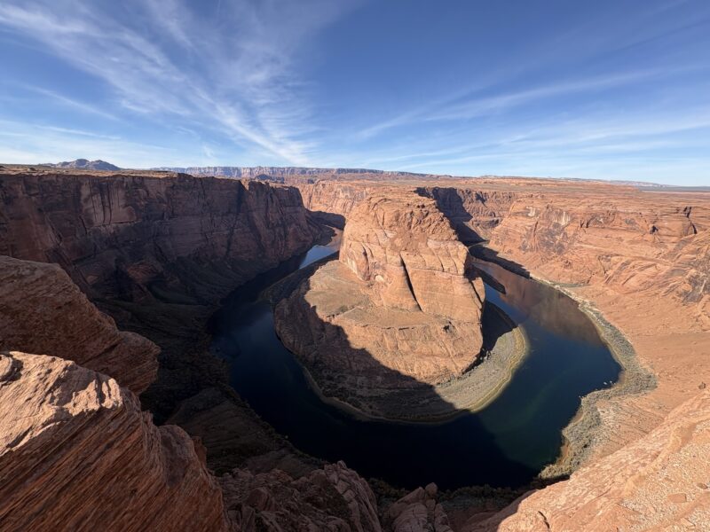 ホースシューベンドは、コロラド川が大きく馬蹄形に曲がる姿を上から見下ろせる絶景スポットです。高さ約300mの断崖から見下ろす景色は迫力満点で、アリゾナ旅行の定番フォトスポットとして人気があります。駐車場から展望ポイントまでは片道約15〜20分の歩きやすいトレイルでアクセス可能です。