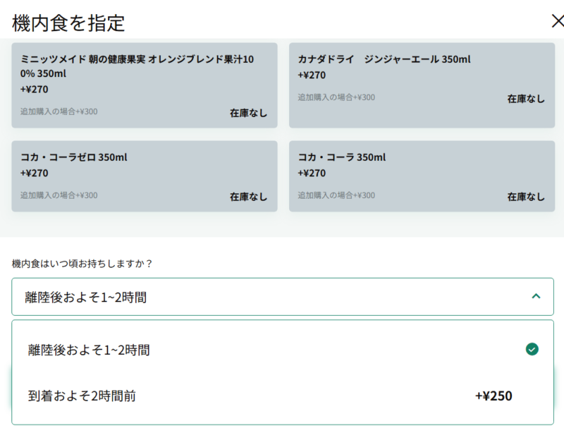 事前購入の場合は、以下の通り追加の飲み物を割引価格で購入できます。なお、事前購入で飲み物が在庫切れの場合でも、当日機内で購入できることがほとんどですので安心してください。また、機内食を運んでもらう時間も選ぶことができます。